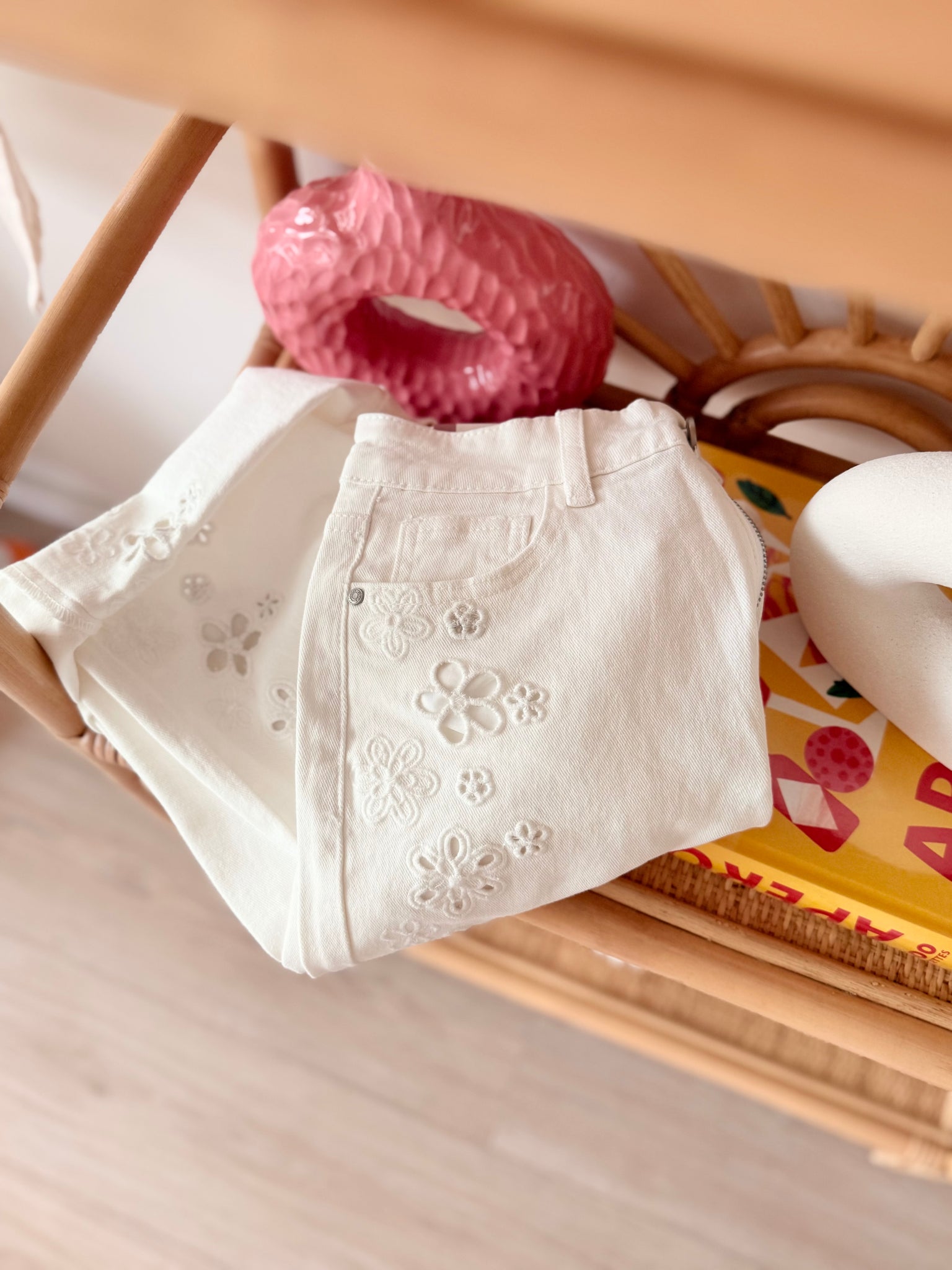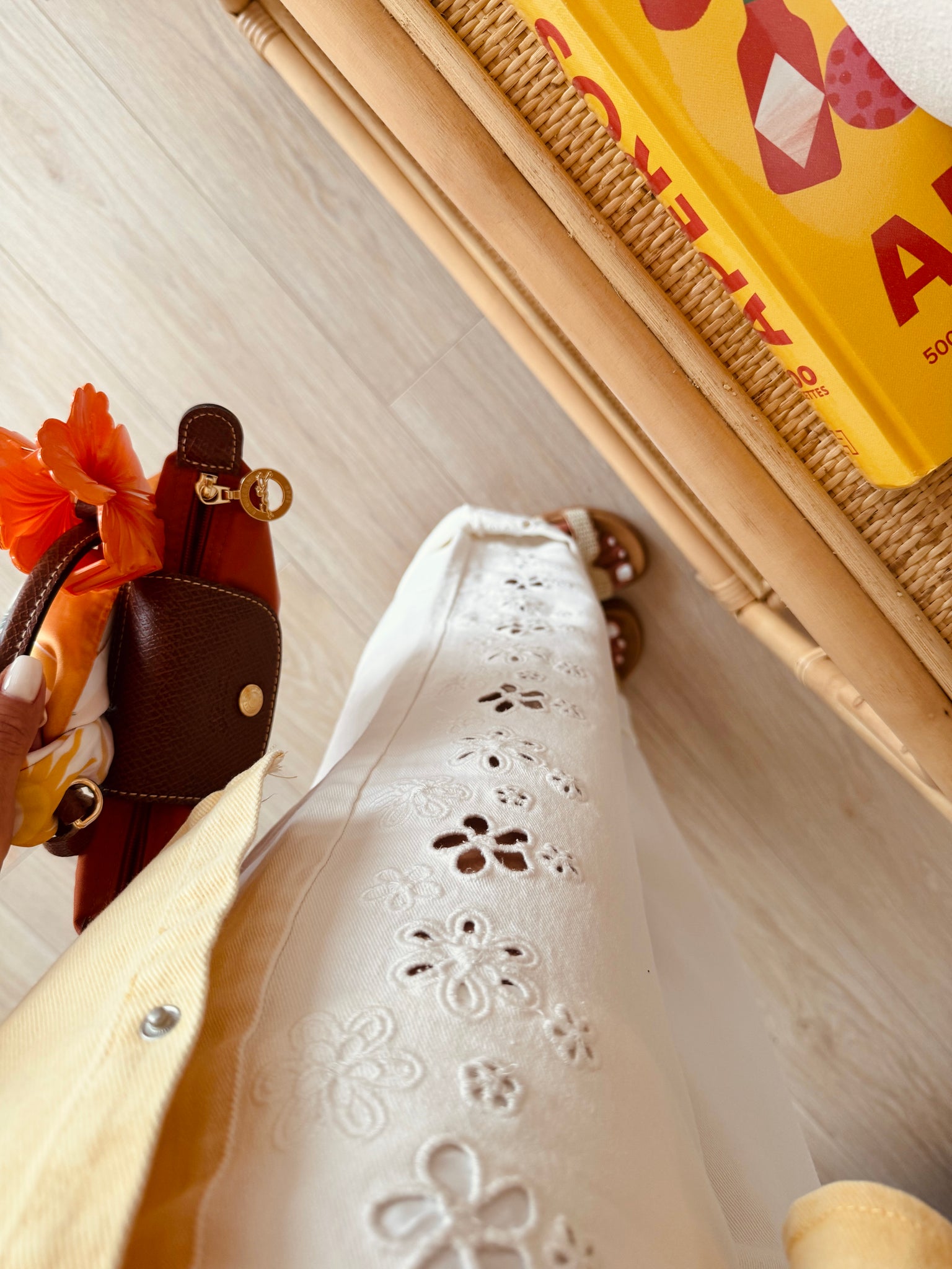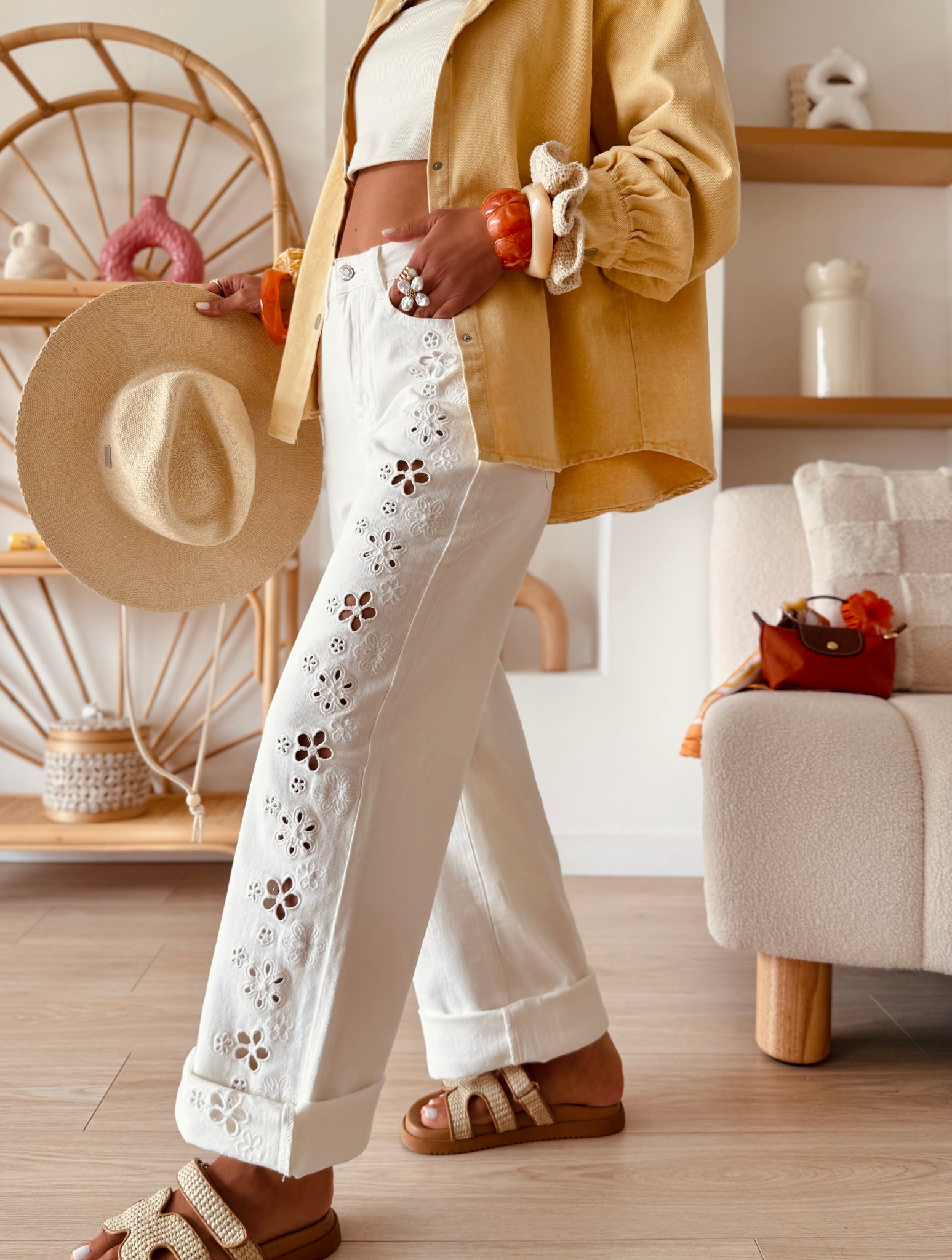 Ce jean blanc revisite le classique denim avec une touche bohème délicate et solaire. Il est pensé pour celles qui aiment allier confort et style !