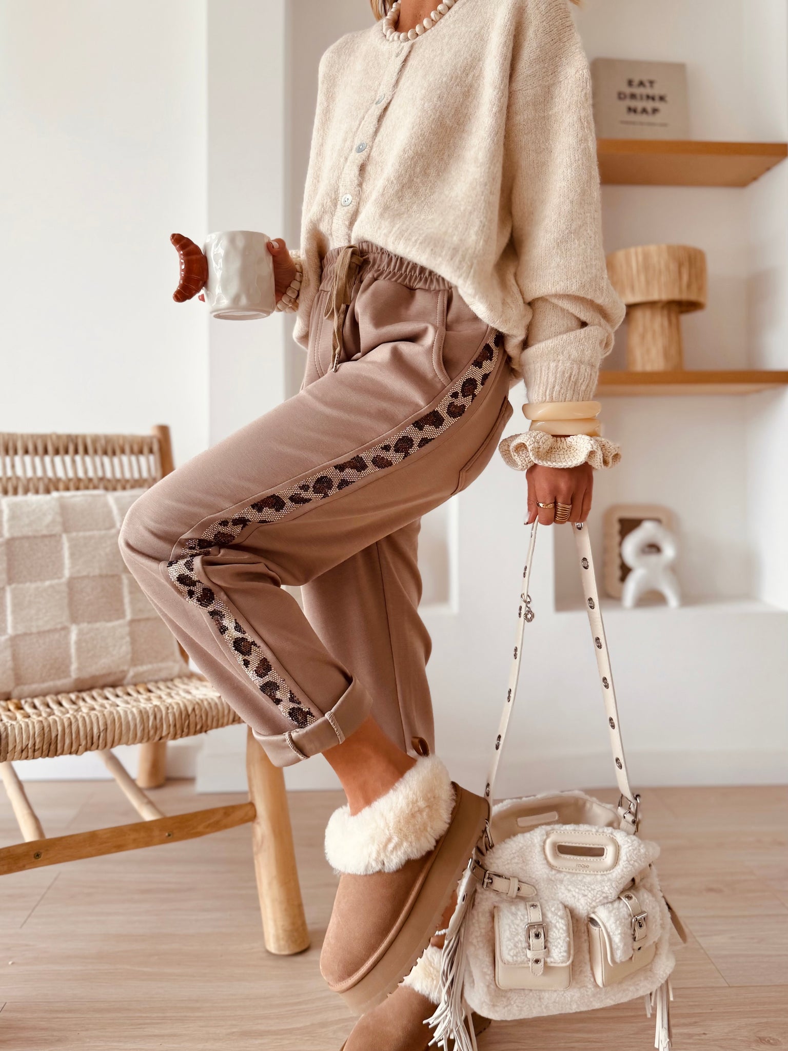 De style jogging, ce pantalon à l’allure décontractée, se démarque avec ces jolies bandes de strass disposées sur les côtés, formant un imprimé léopard tellement tendance !