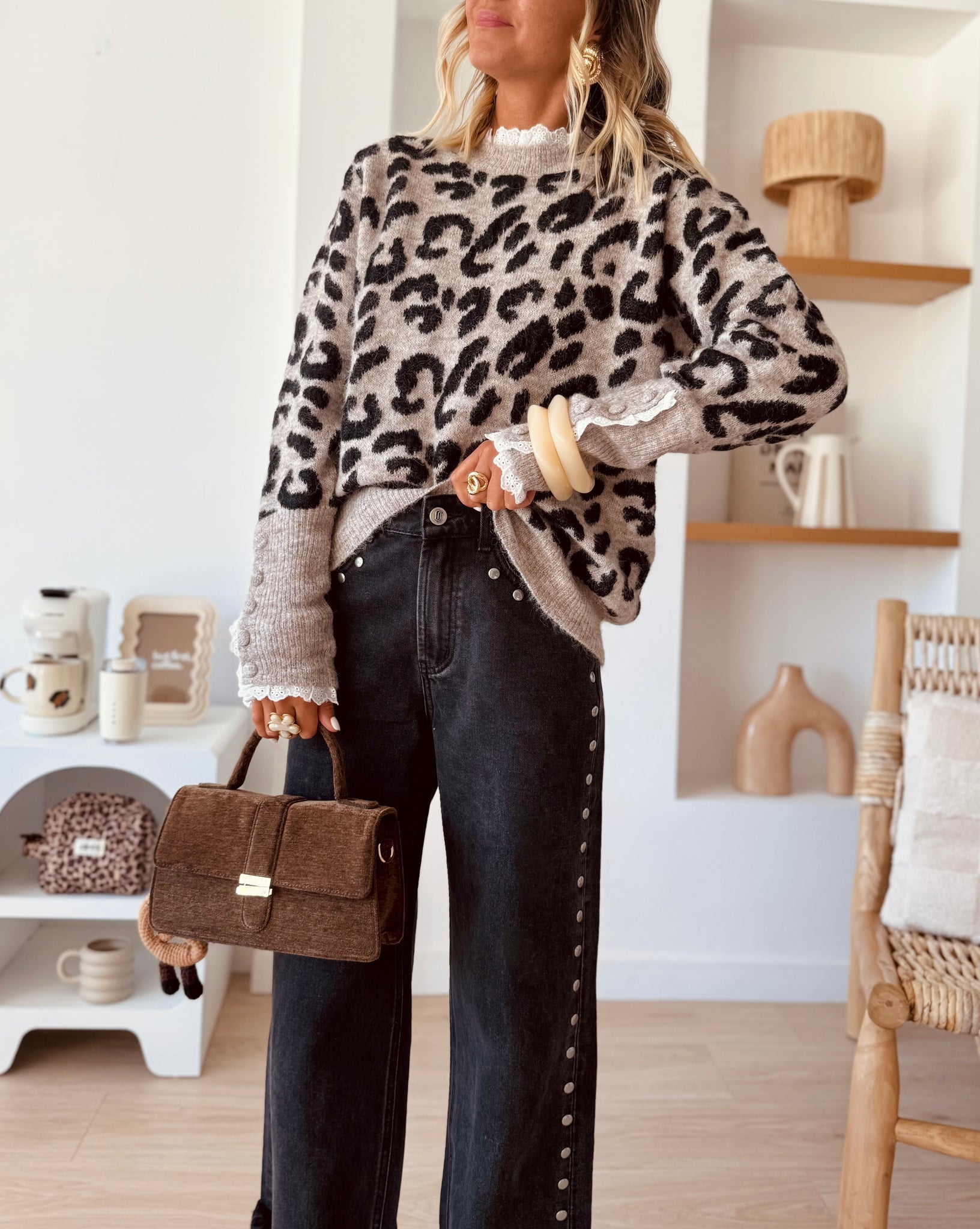 & un imprimé léopard noir qui contraste la douceur de la dentelle.