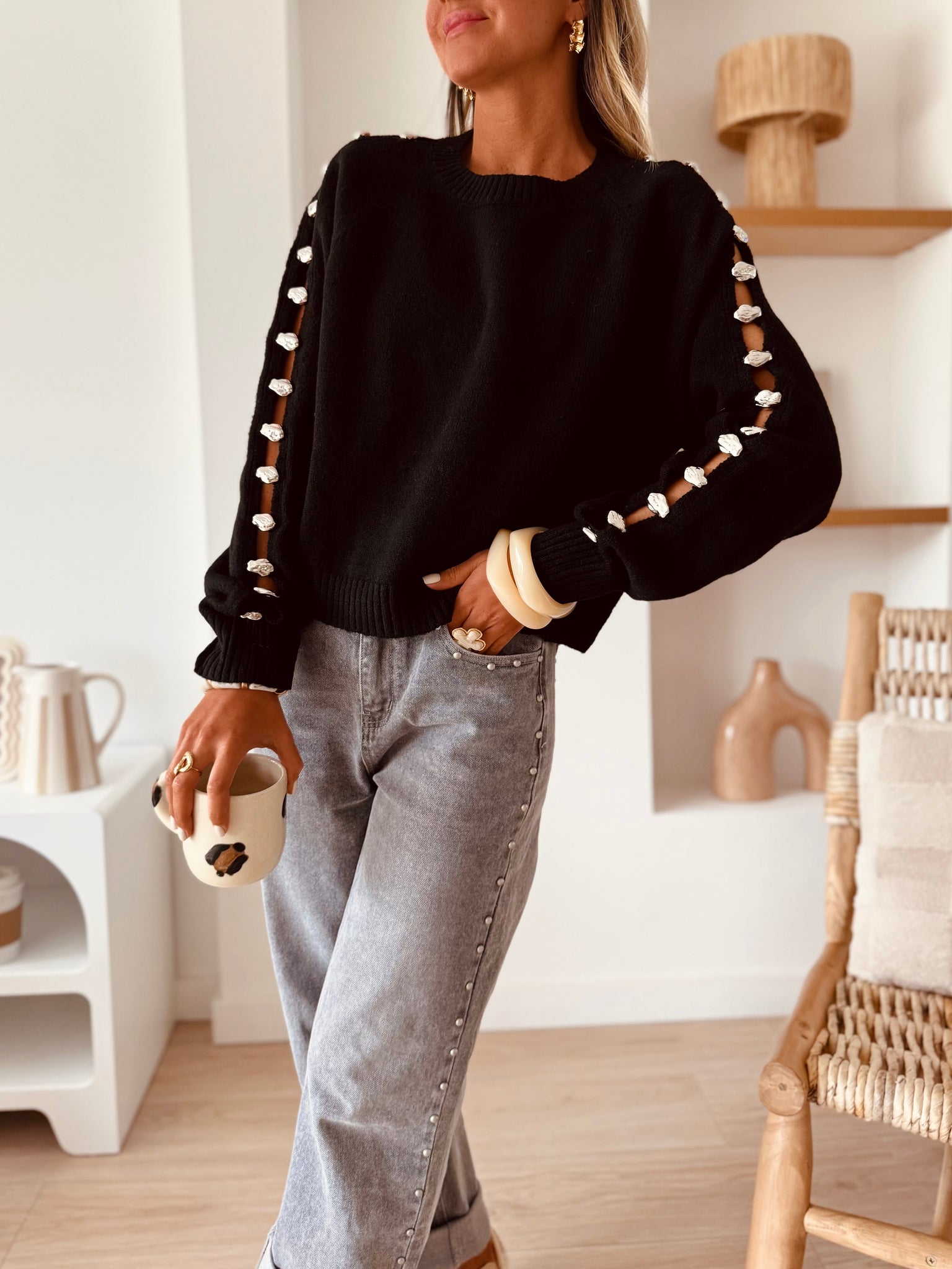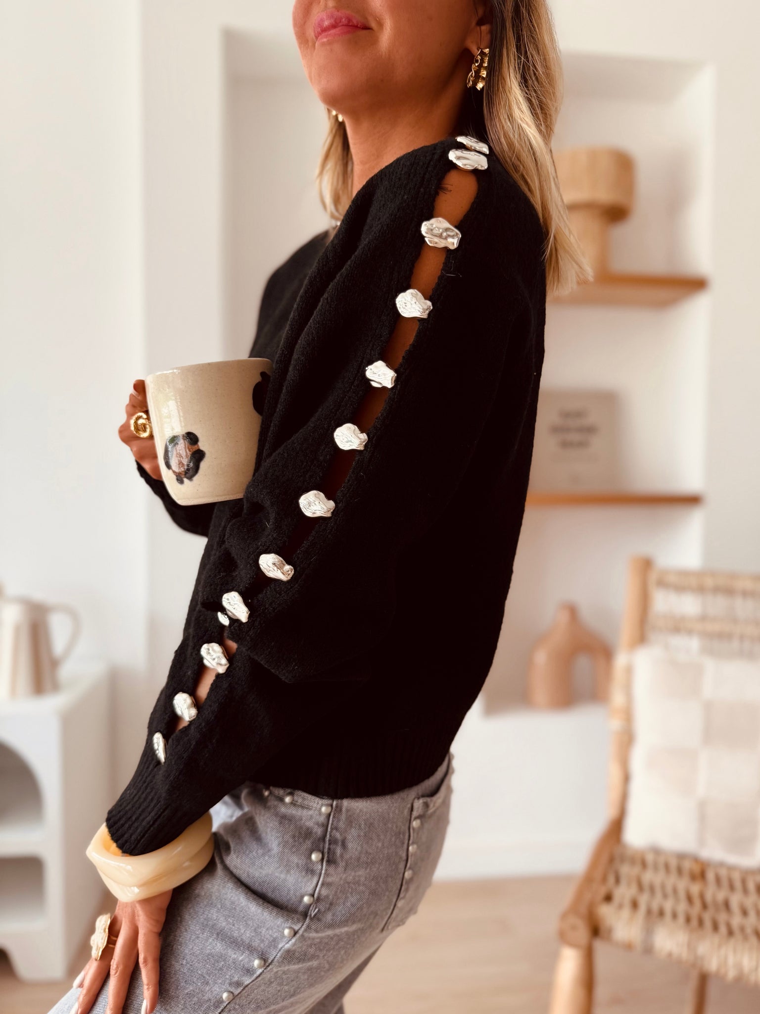 Ce pull noir revisite le pull trop classique avec une touche moderne et féminine. Ses manches longues sont ornées d’ouvertures délicatement reliées par des perles argentées !