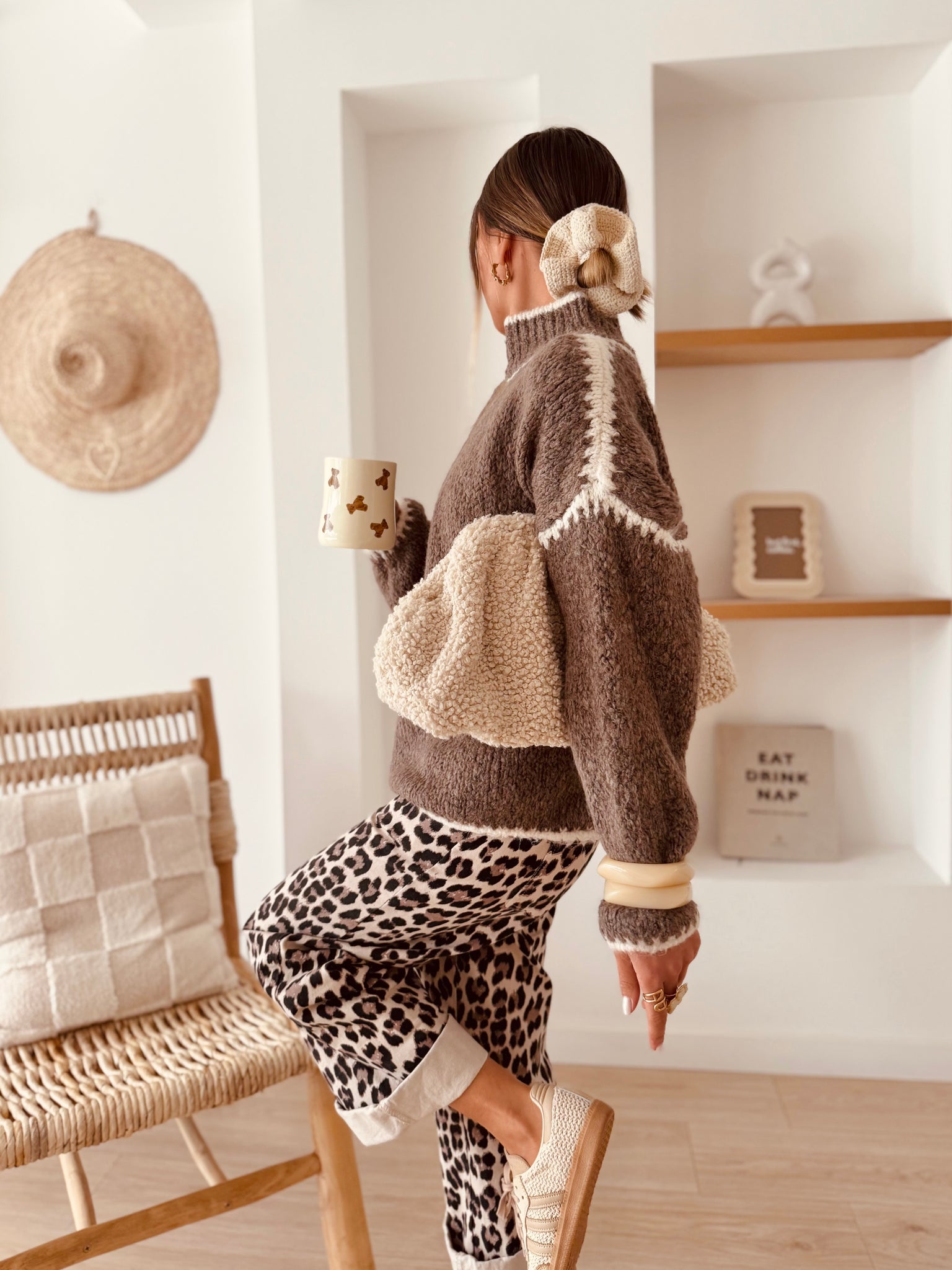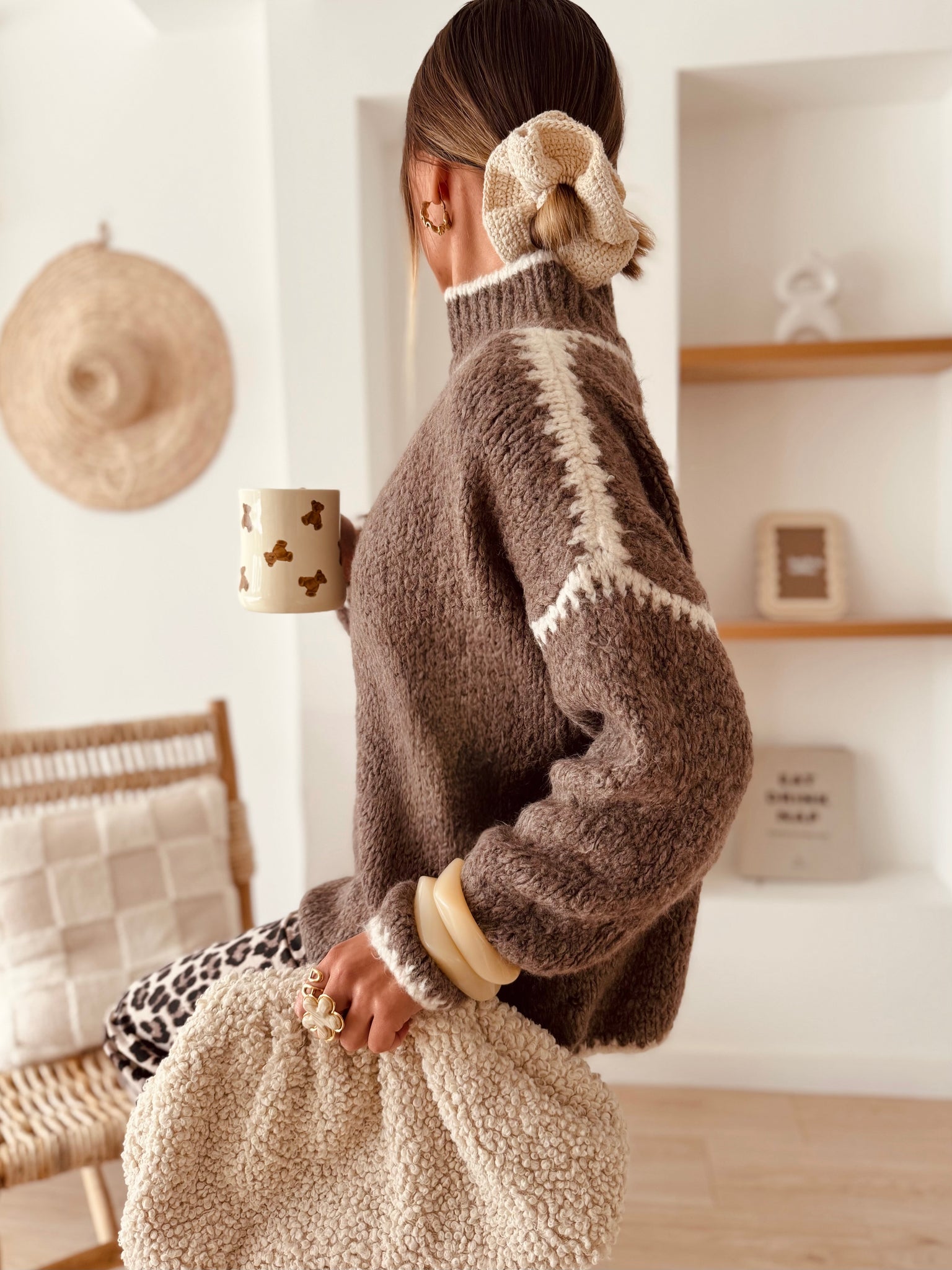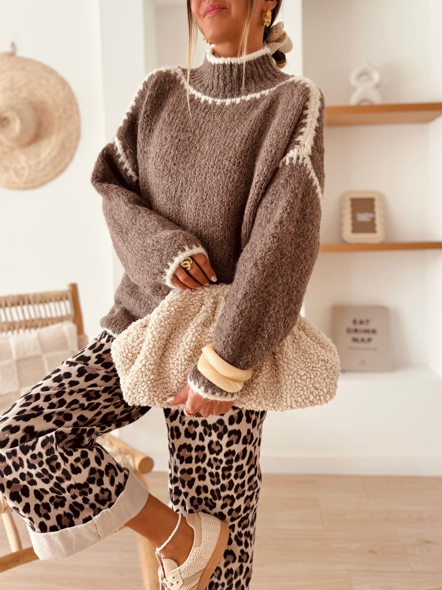 Son coloris marron glacé, doux et intemporel, dispose de jeu de coutures blanches sur les épaules, le col et les bords, qui apportent une touche d’originalité !
