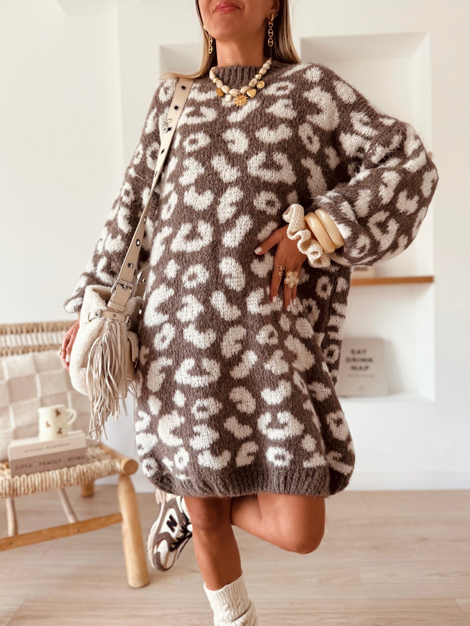 Craquez pour cette robe pull ultra tendance au motif léopard revisité dans des tons doux et naturels !!
