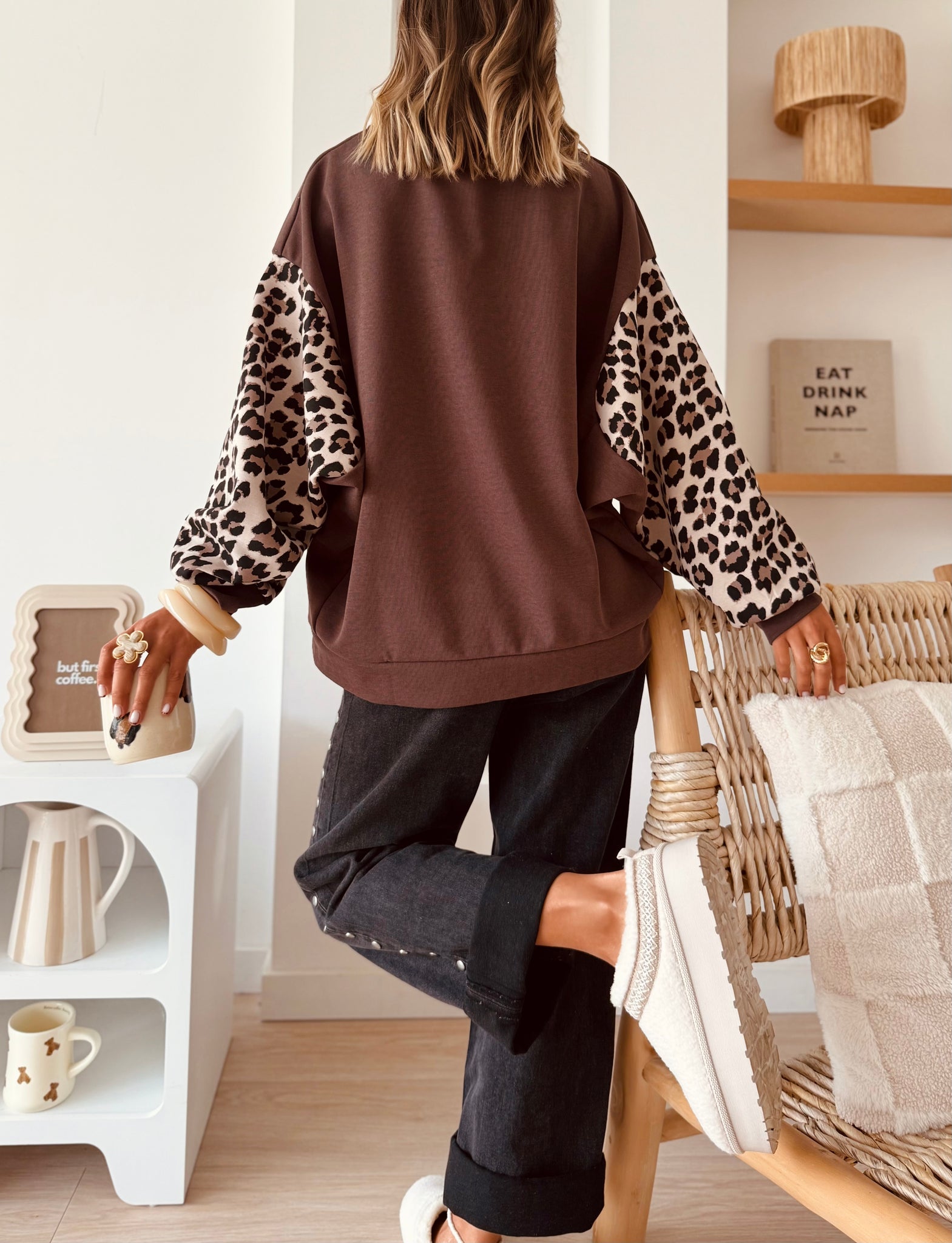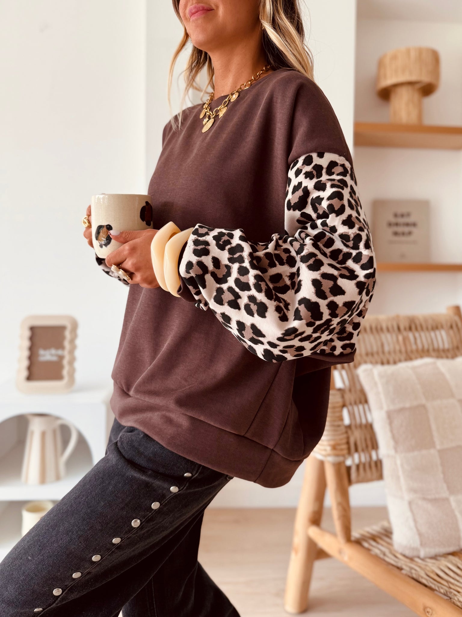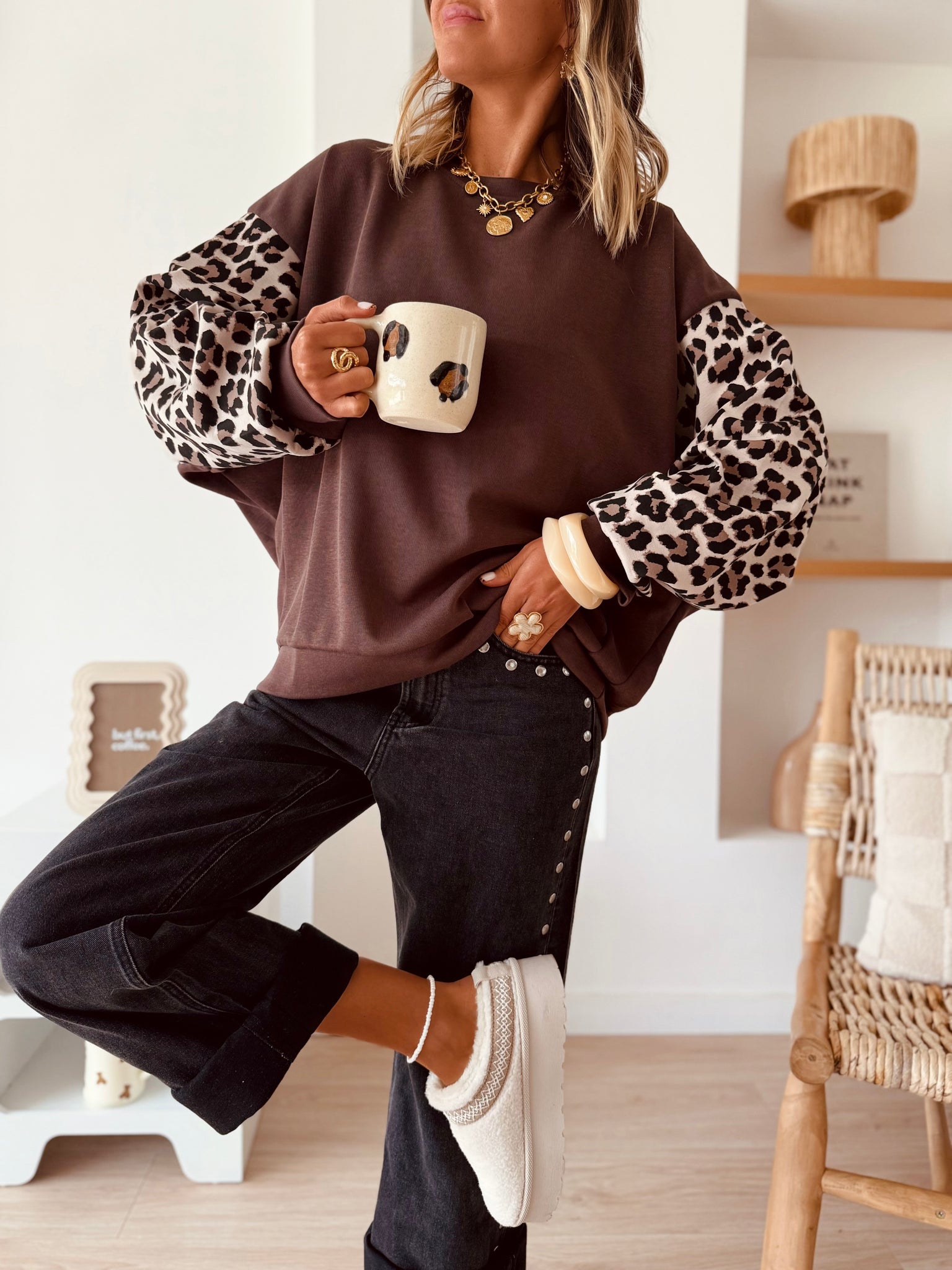 Le sweat est recouvert d’un coloris chocolat hyper réconfortant, et dispose de manches à l’imprimé léopard CANON !