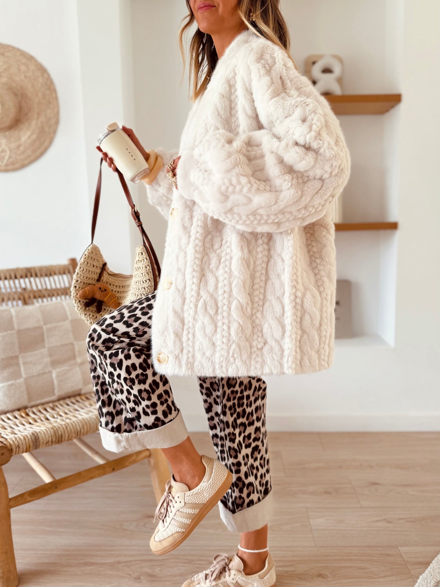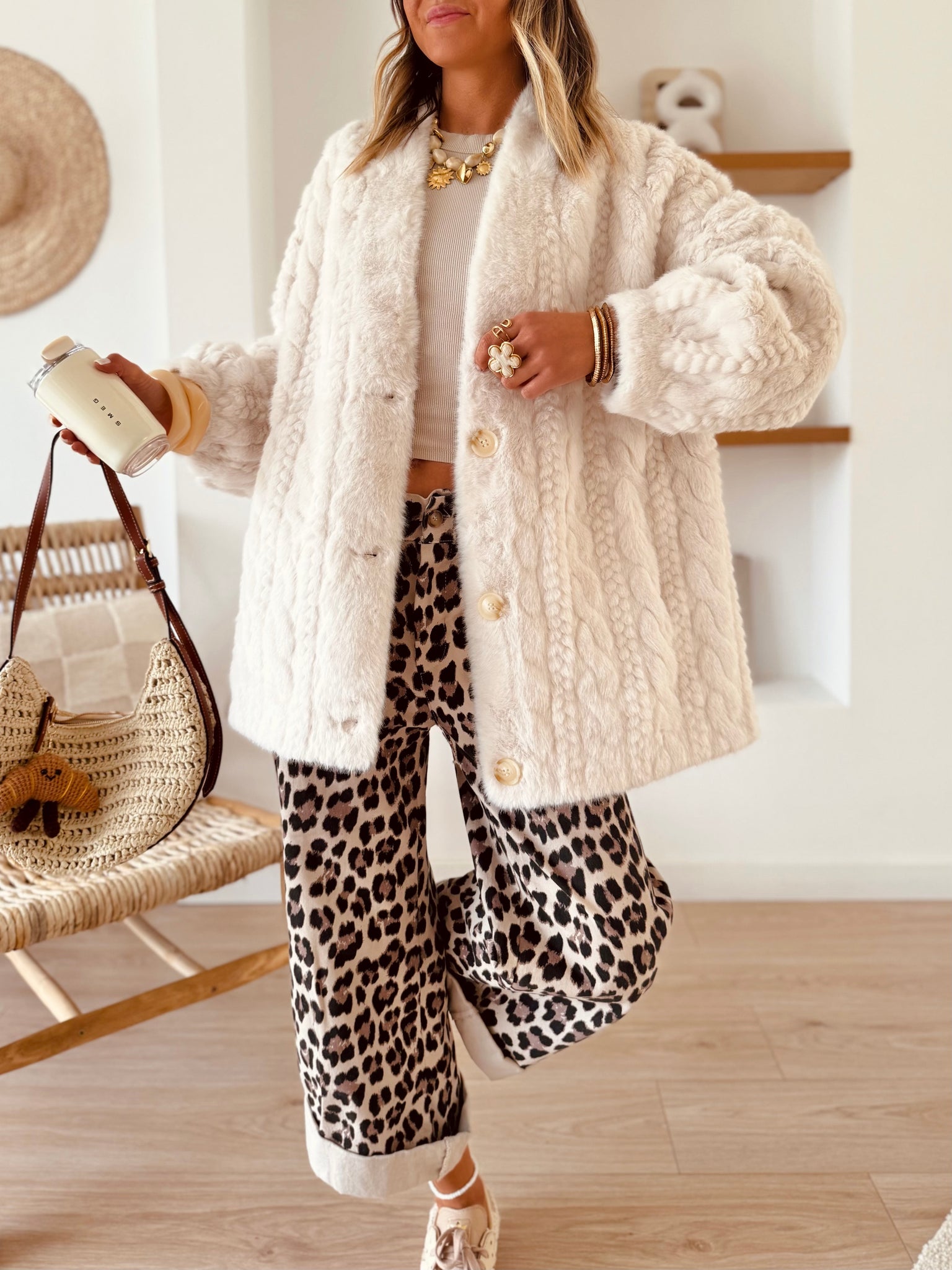 Plongez dans le confort absolu avec notre manteau oversize en fausse fourrure effet tricoté nommé « JOLIA ».
