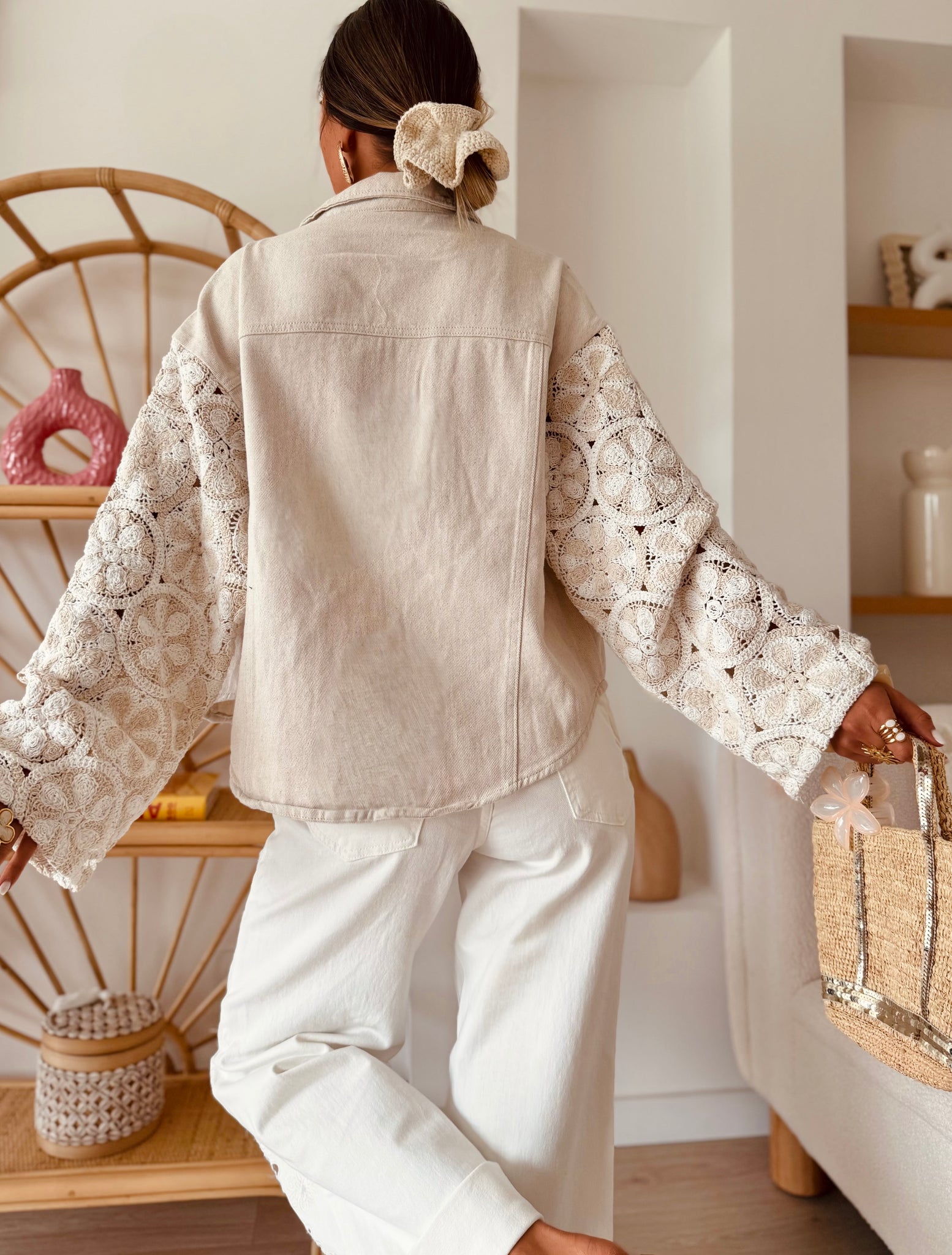 Une veste beige sable en coton, à la matière qui tombe à pic pour les beaux jours.