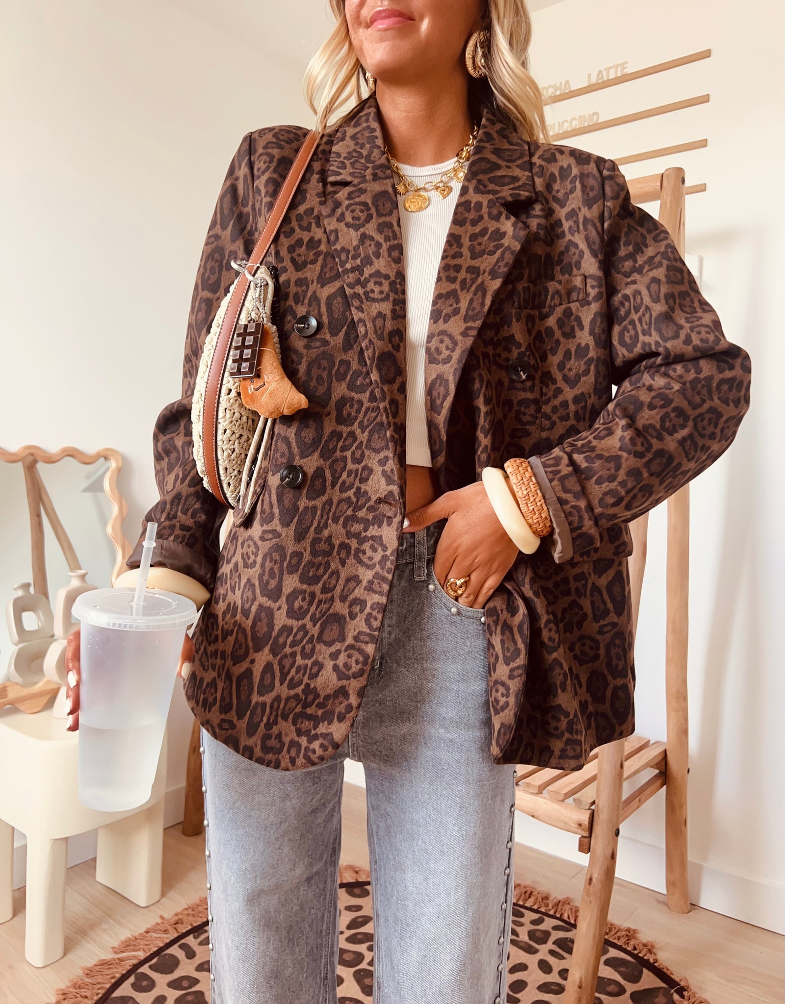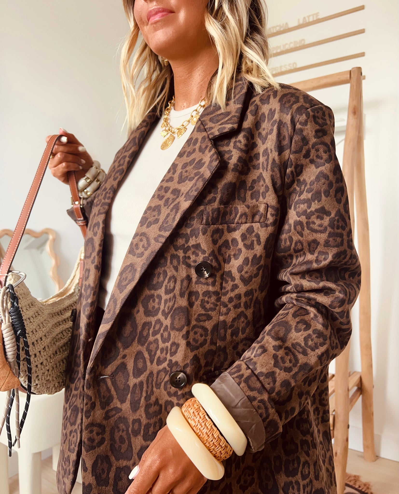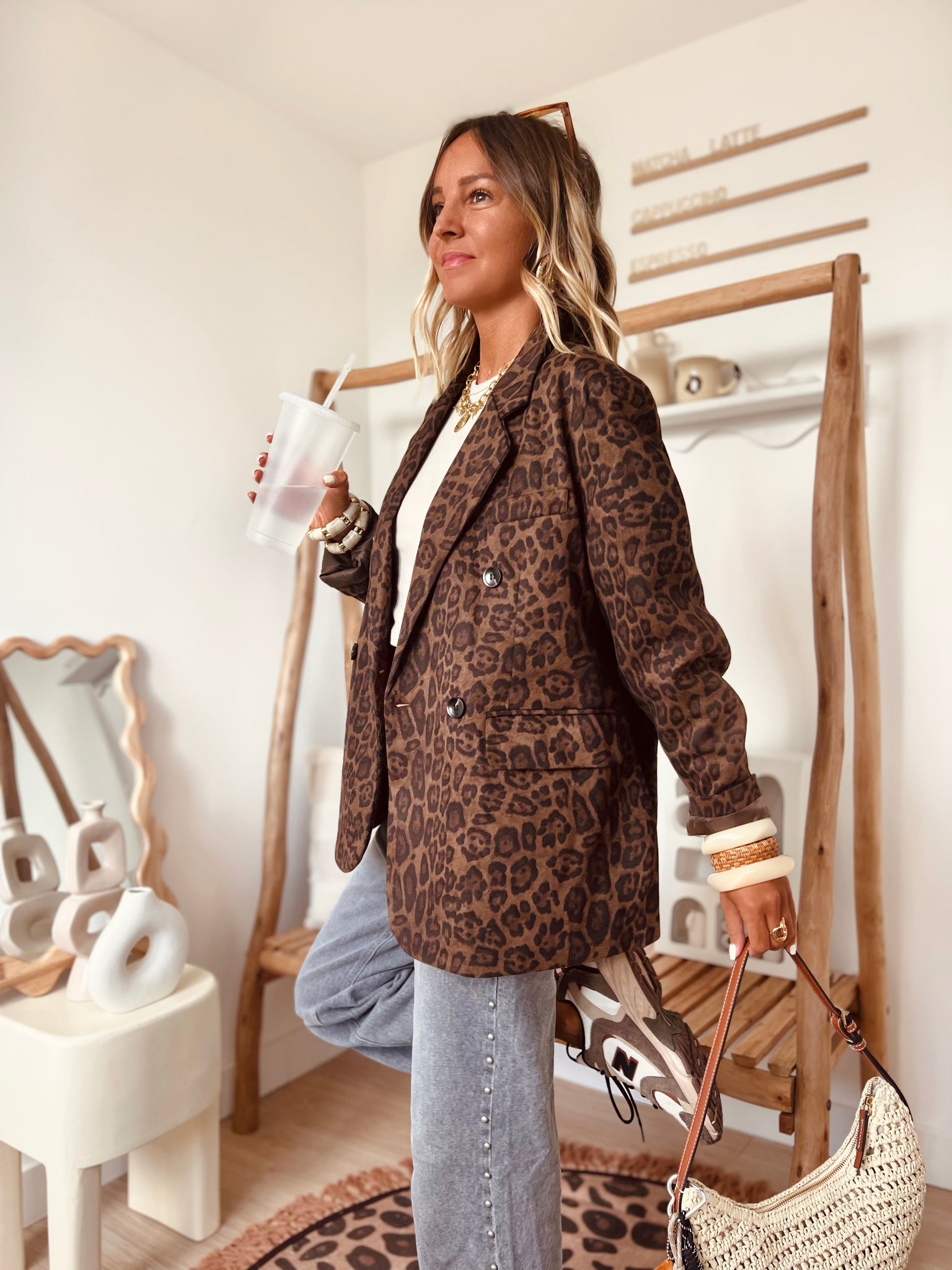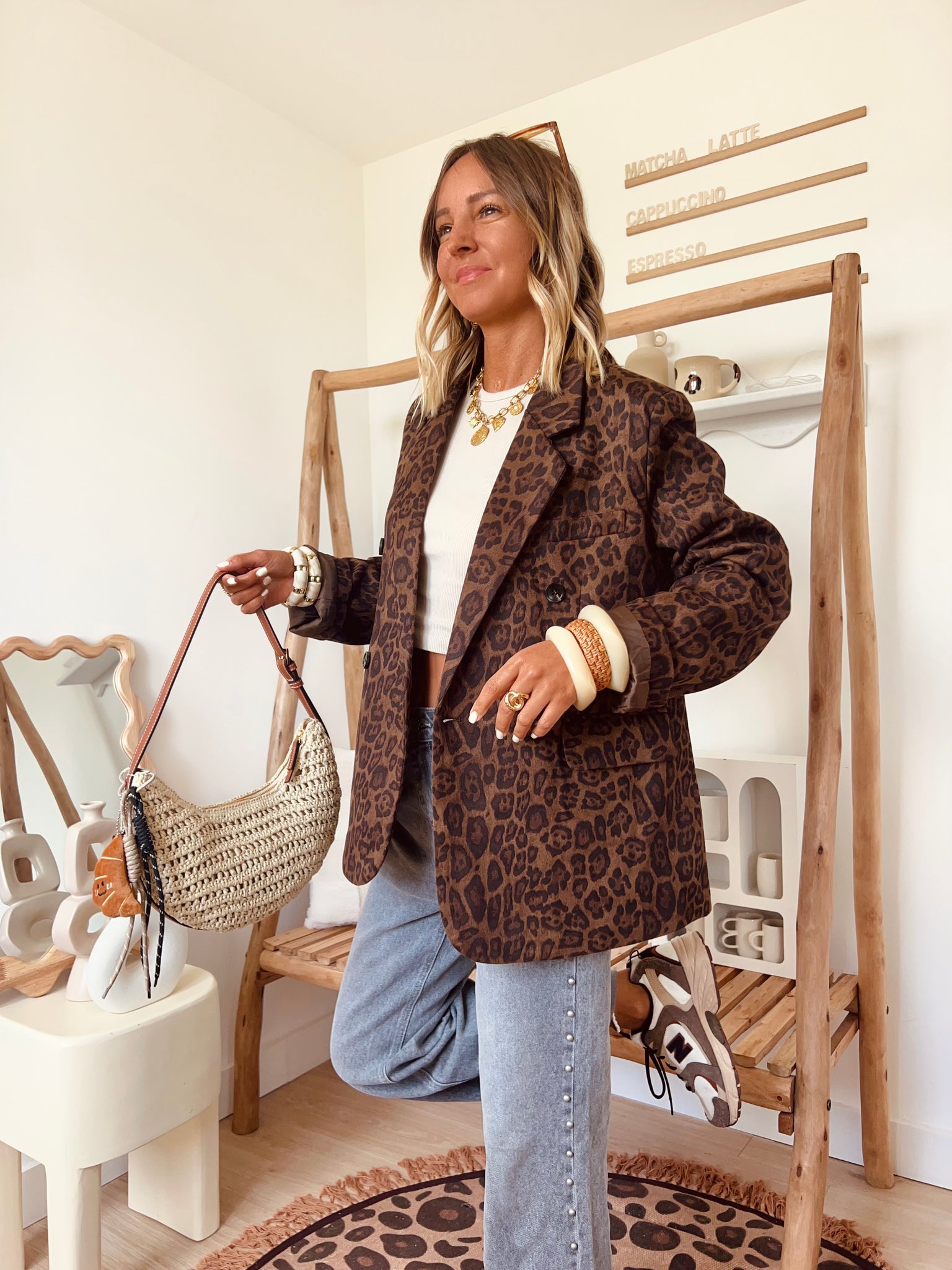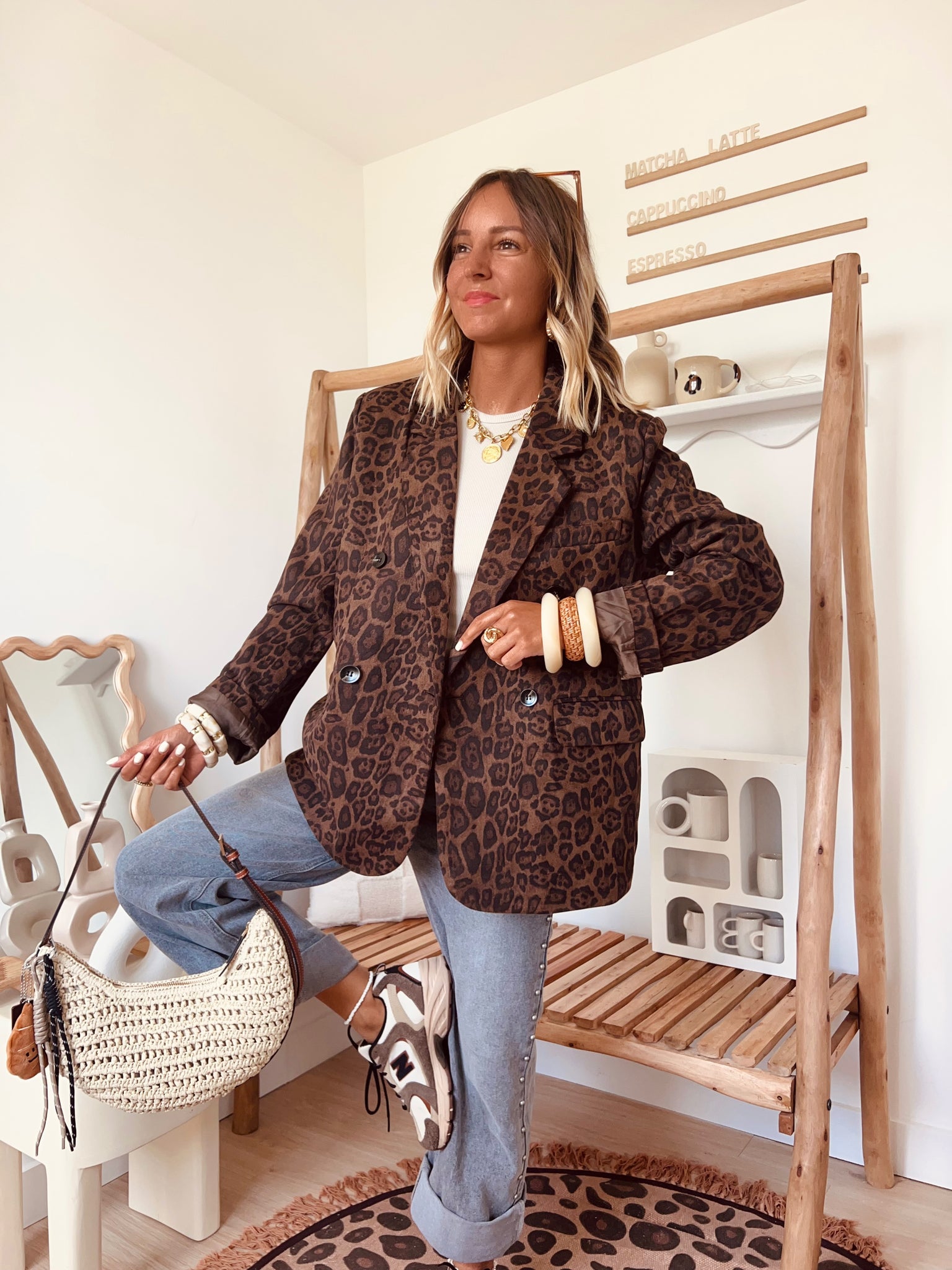 Ne passez pas à côté de LA pièce phare de cette collection : le fameux blazer recouvert de cet imprimé léopard marron enivrant nommé EVY, à la matière effet daim réconfortante pour l’automne !🍂