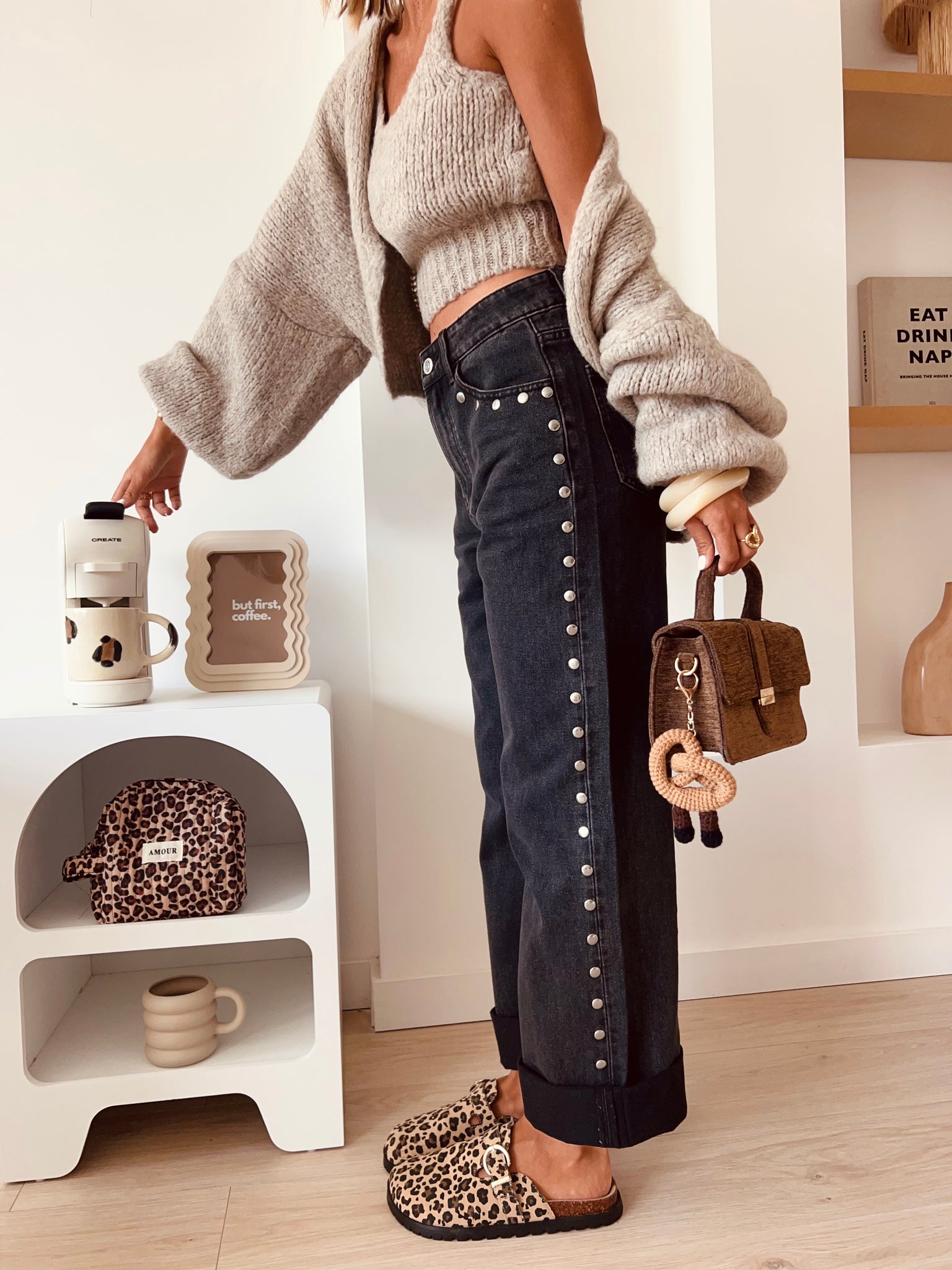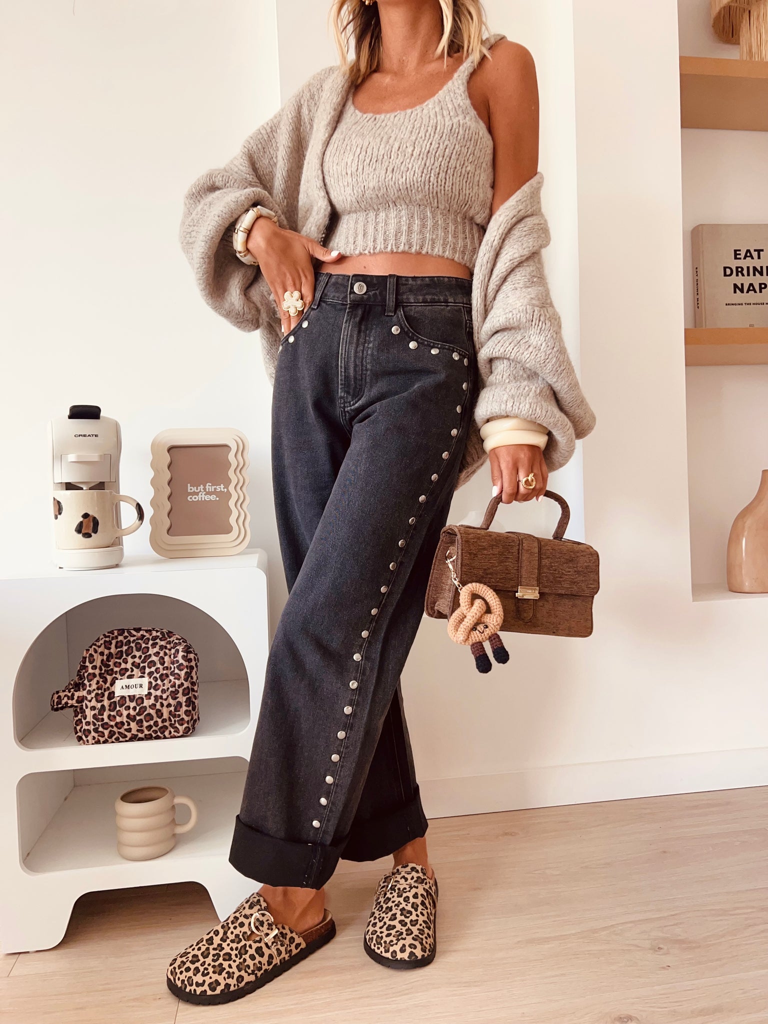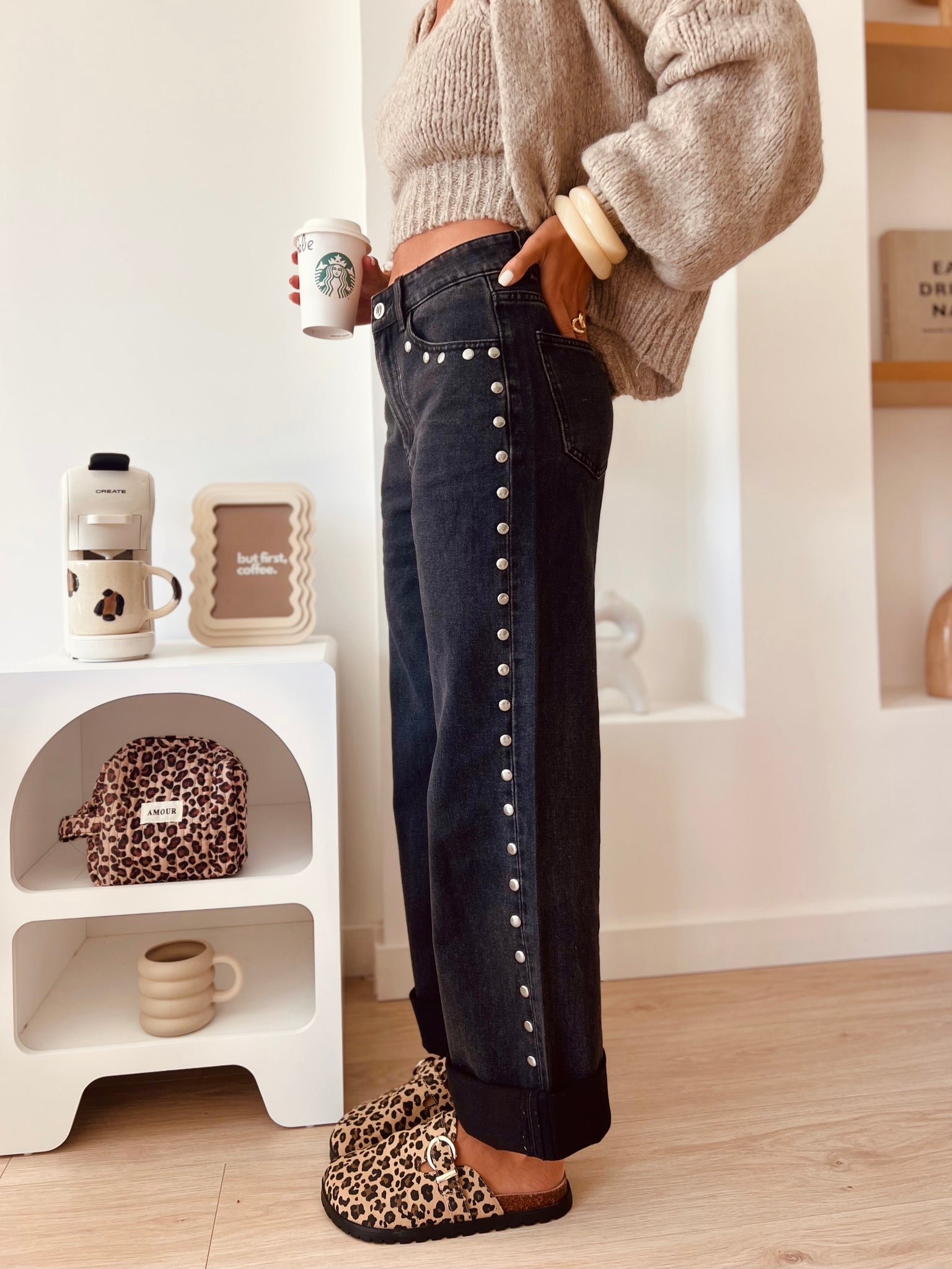 Une coupe wide leg hyper tendance, un coloris noir délavé, et des détails cloutés sur le côté qui le rendent incroyablement stylé ! (Il a des petits airs de notre jean Octavie gris que vous avez adoré !)🙊